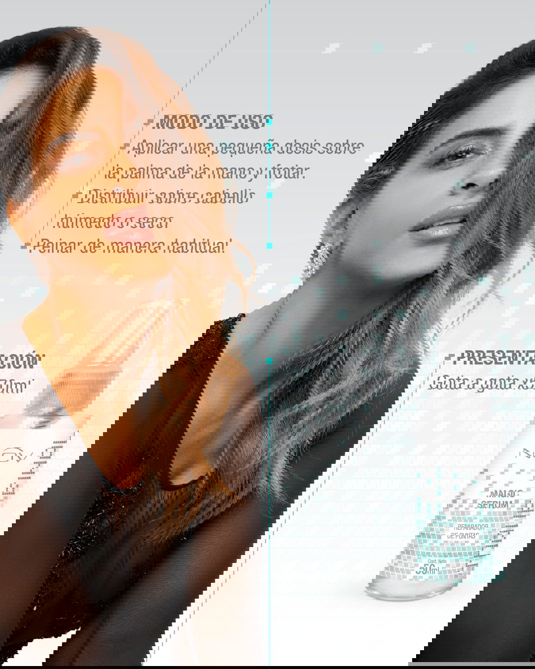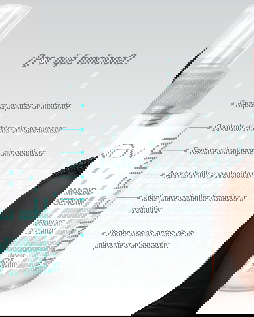 Ideal para cabellos rebeldes, dañados o tratados químicamente, Magic Serum repara las puntas abiertas, aporta brillo instantáneo y suaviza al tacto.