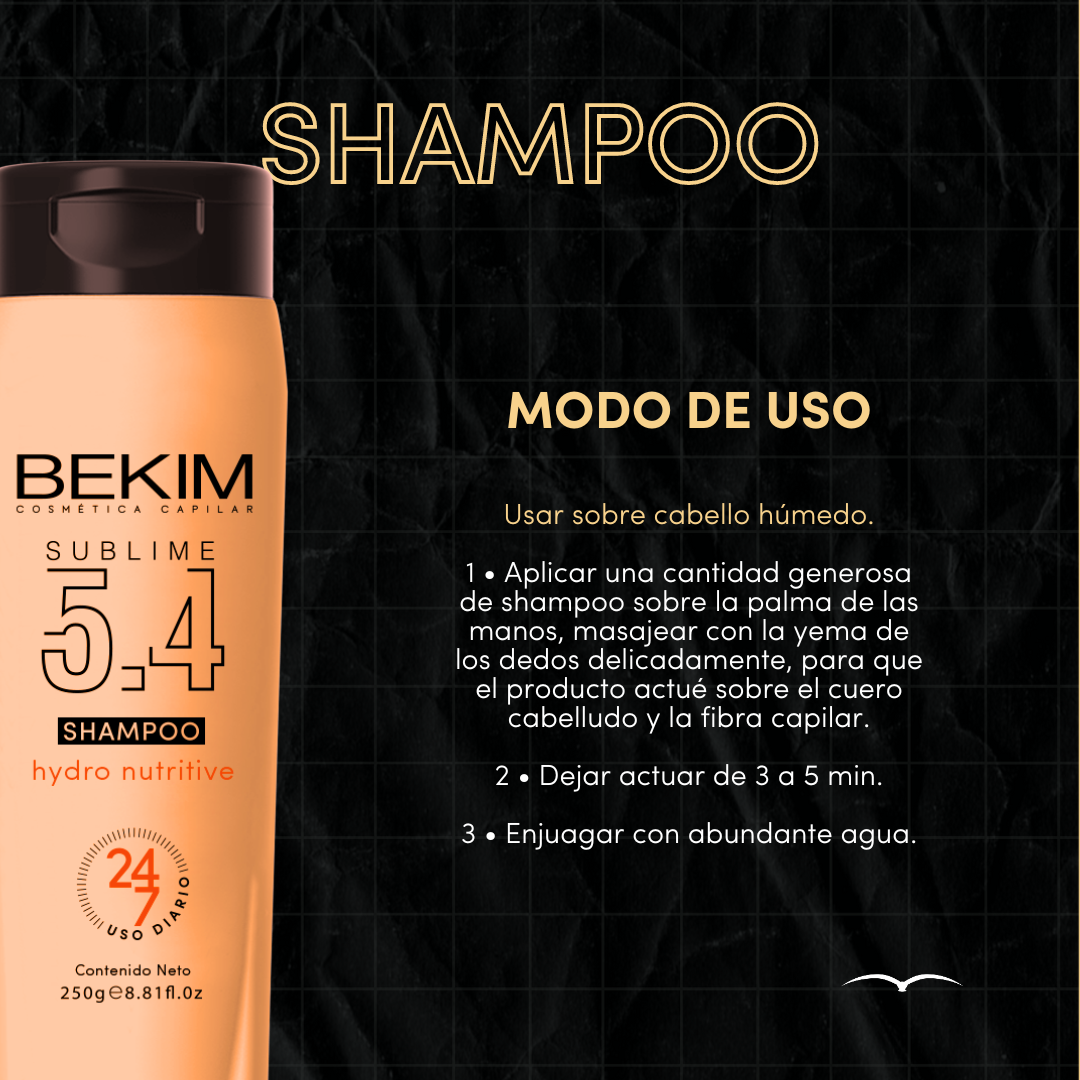 Modo de uso: Usar sobre cabello húmedo. Aplicar una cantidad generosa de shampoo sobre la palma de las manos, masajear con la yema de los dedos delicadamente, para que el producto actué sobre el cuero cabelludo y la fibra capilar. Dejar actuar de 3 a 5 min y enjuagar con abundante agua.